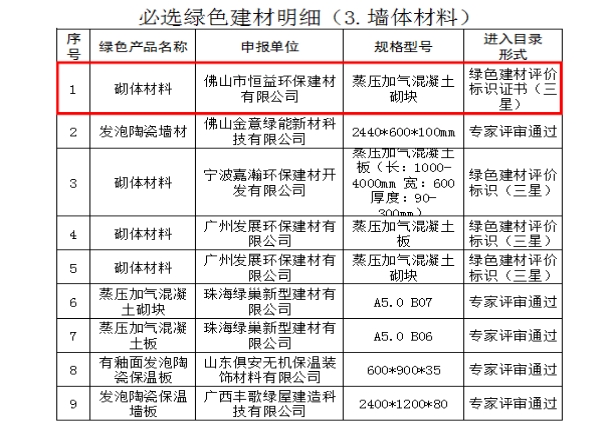 4月28日,恒益環(huán)保建材順利通過《佛山市綠色建材目錄》評(píng)審,標(biāo)志著公司生產(chǎn)的蒸壓加氣混凝土砌塊符合佛山氣候特點(diǎn)、建筑特點(diǎn)的建材標(biāo)準(zhǔn)。