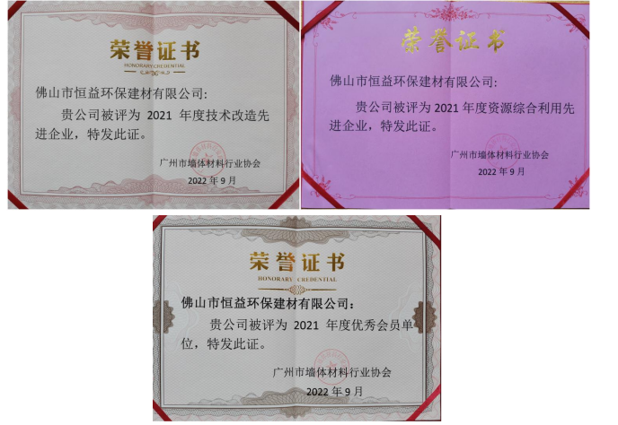 9月27日,經(jīng)廣州市墻體材料協(xié)會評選,佛山市恒益環(huán)保建材有限公司榮獲“2021年度技術(shù)改造先進企業(yè)”、“2021年度資源綜合利用先進企業(yè)”、“2021年優(yōu)秀會員單位”榮譽稱號,“蒸壓加氣混凝土砌塊生產(chǎn)質(zhì)量和節(jié)能技術(shù)改造” 研發(fā)項目獲科技創(chuàng)新二等獎,員工曾慶文同志獲廣州市墻材行業(yè)“優(yōu)秀工匠”稱號。