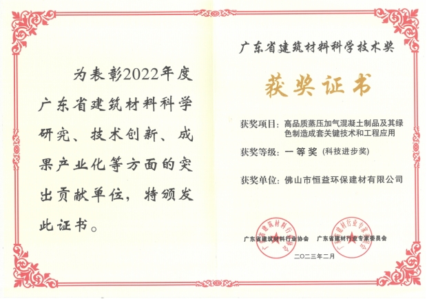 近日,廣東省建材行業(yè)高質量發(fā)展會暨廣東省建筑材料行業(yè)協(xié)會第五屆一次會員大會在佛山舉行。恒益環(huán)保建材公司項目成果“高品質蒸壓加氣混凝土制品及其綠色制造成套關鍵技術和工程應用”被授予“廣東省建筑材料科學技術獎一等獎”稱號!與此同時,還獲得了“綠色制造優(yōu)秀企業(yè)”“科技創(chuàng)新優(yōu)秀企業(yè)”“質量標準品牌建設先進個人”等多項集體及個人榮譽。